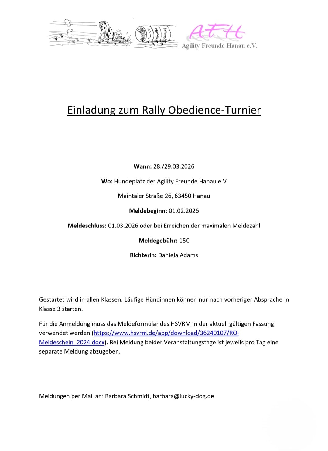 Einladung zum Rally Obedience-Turnier Der Meldeschluss zu unserem Rally Obedience-Turnier wurde verlängert! Aktuell sind noch Meldungen möglich. Zum Anmeldeformular